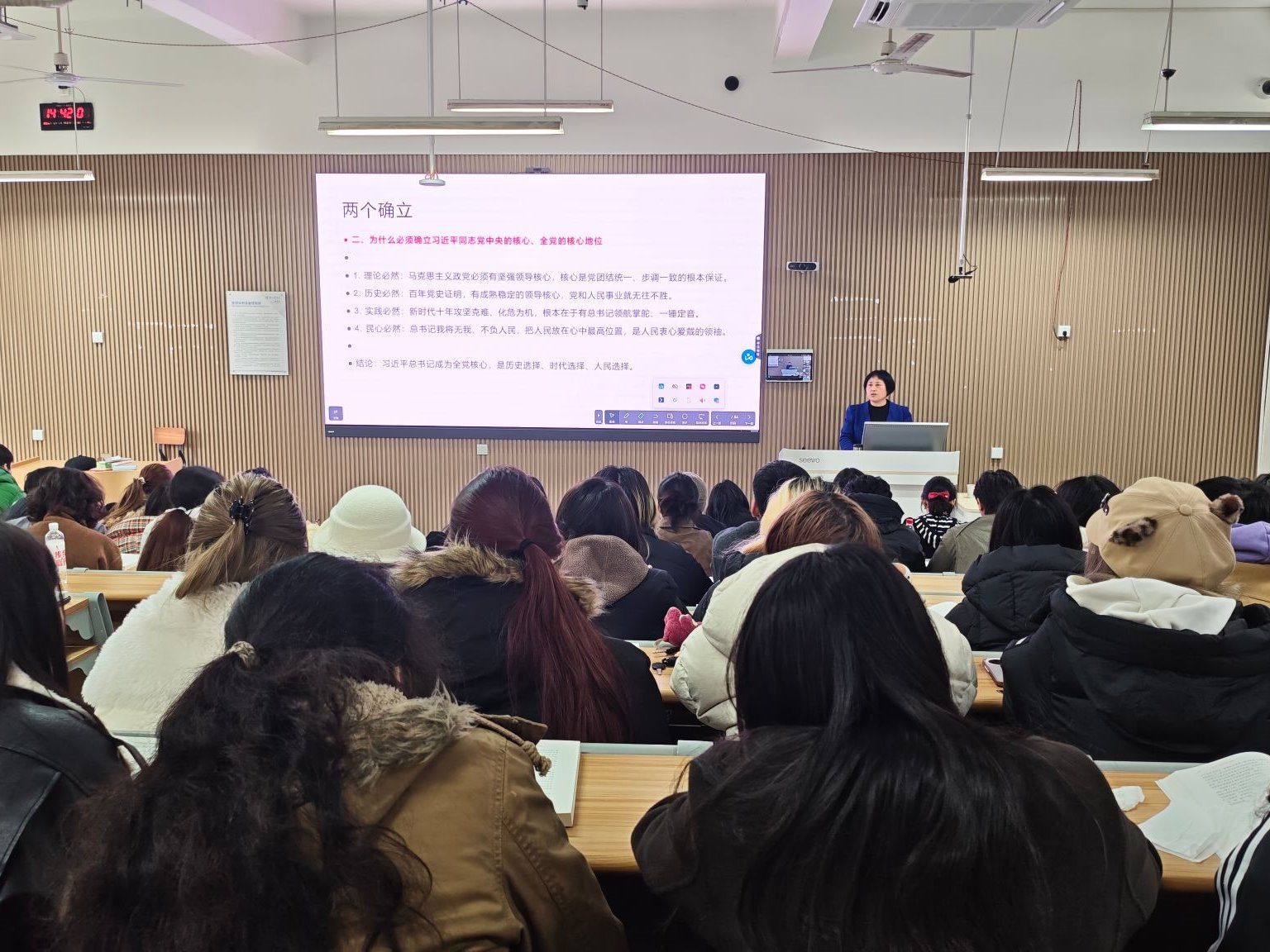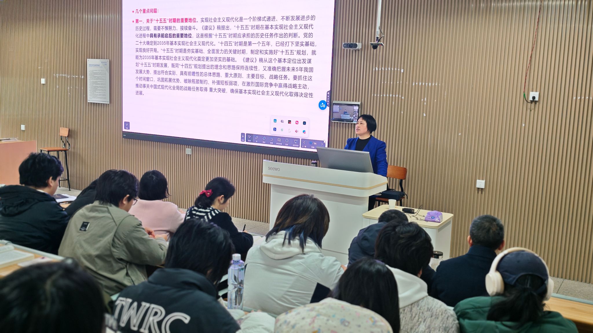 为深入学习宣传贯彻党的二十届四中全会精神,推动党的创新理论入脑入心,3月4日下午,校党委书记鲍清芬以“坚定拥护核心领航 奋进‘十五五’新征程”为题,在A12教学楼205智慧教室为马克思主义学院全体教师、2024级影视动画学院60余名本科生作宣讲报告暨专题思政课。